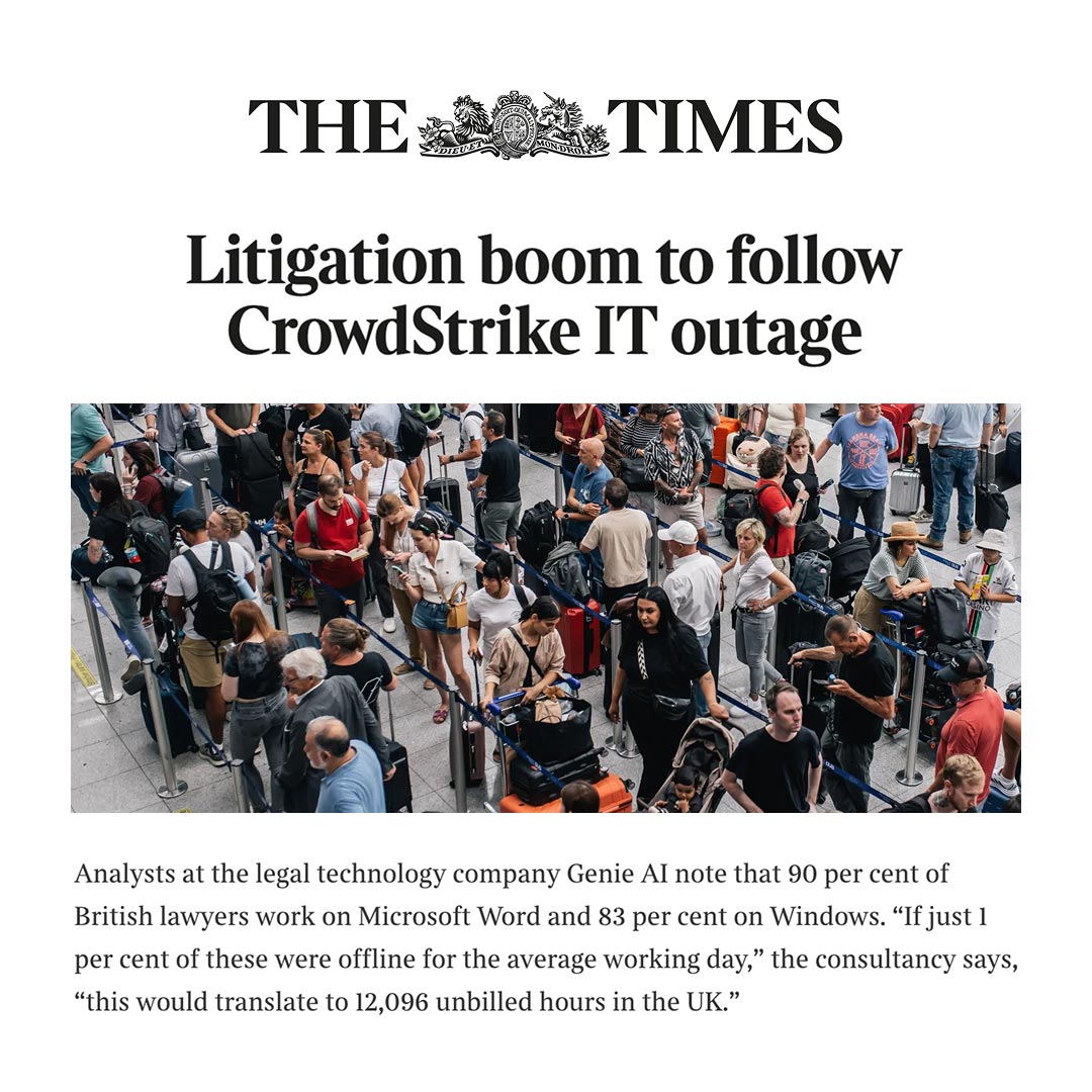 We began with rapid newsjacking during the CrowdStrike outage. We drafted two targeted statements: a CTO quote for national business and tech press on outdated legal industry systems, and a data-led calculation of lost billable hours for legal media. This combination enabled Genie to cut through and offer timely, authoritative analysis.
